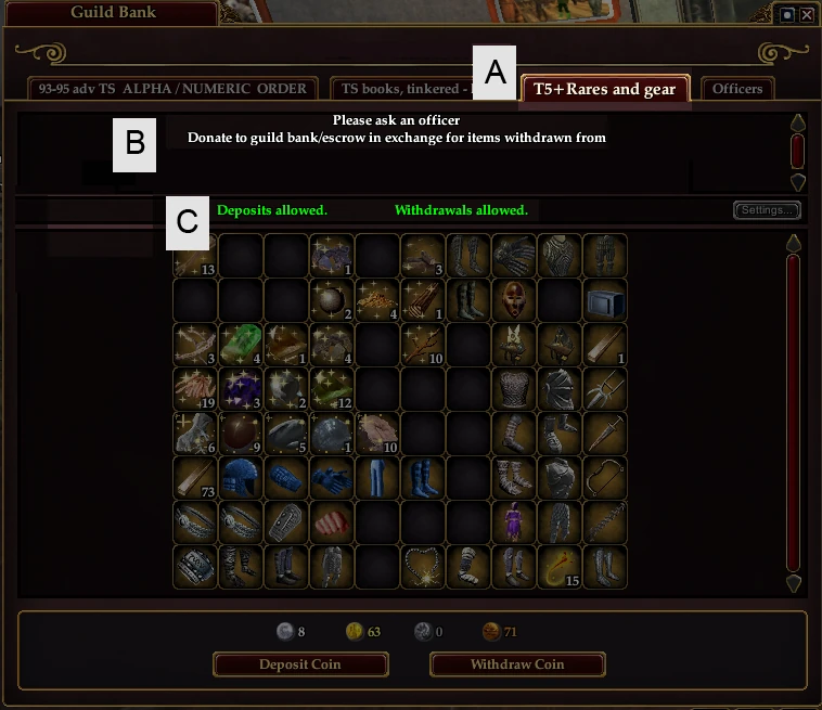 Click here for my guild lobby/hall video guide! However, i don't believe there is any way of interacting with the guild window with isxeq2. But most importantly the guild manager tool kept track of every item going in or being removed from the bank and who did the bank transaction.