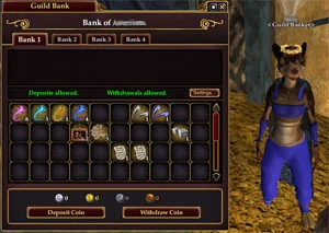 This new functionality will allow guild members to share items and coin more freely as well as help members offset the cost of soul mending. The guild gains experience when its members perform tasks that earn city status. Items that are deposited into the guild bank will be cycled through and sold after two weeks by the guild mule, and the proceeds added to the money in guild bank four for the future purchase of cloak upgrades and guild events.